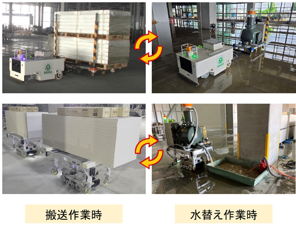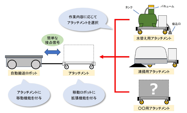 水替えアタッチメントをより多くの自動搬送ロボットで汎用的に活用できるようにするため、両社は実証実験を続けて作業効率や安全性を高める改良を施す予定。掃除などの機能を付与する新たなアタッチメントの開発も進め、自動搬送ロボットの導入効果向上と生産性向上をさらに進めていくことを目指す。