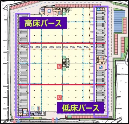 陸・海・空のアクセスが良好な立地特性で多様な車両と荷物を扱うことが見込まれるとして、低床・高床のハイブリッド両面バースを採用する。