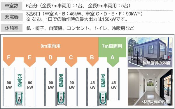 全長9mのEVトラックにも対応し、最大6台の車両を同時に急速充電することが可能。充電時間中にドライバーが休憩できる設備も導入している。