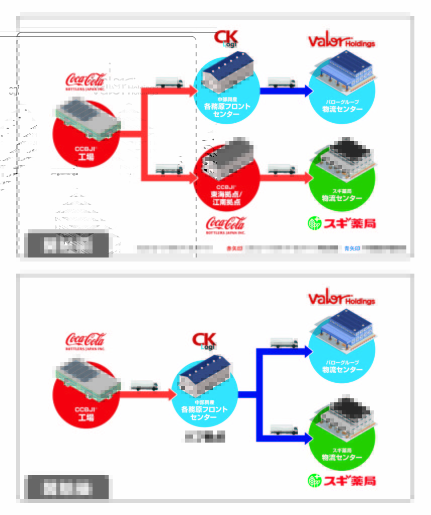 コカ・コーラの工場からの納品拠点を、中部興産の「各務原フロントセンター」(岐阜県各務原市)に集約した後、中部興産がバローグループおよびスギ薬局の物流センターへ輸送することでトラックの積載効率を高め、ドライバーの業務負荷軽減を図る。同センターをハブ拠点と位置付けている。