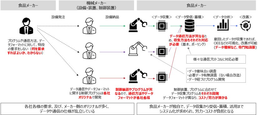 現状、食品製造業で生産設備データの標準規格が存在せず、機械メーカーのデータ仕様・制御プログラムなどは各社でばらばらになっている。食品メーカーの要求仕様も各社各様のため、機械メーカーは、食品メーカー各社向けのプログラムをオリジナルで開発する傾向にある。