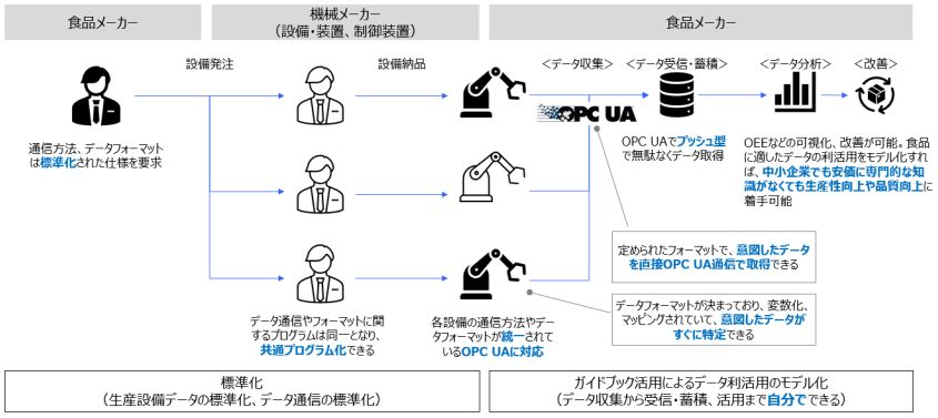 各者は標準規格が普及することにより、専門知識がなくてもデータの活用が容易になり、中小企業でも低コストで生産性や品質の向上に取り組めるようになると想定。具体的には予防保全・品質管理・稼働率の向上など、製造プロセスの高度化やスマートファクトリー化につなげていくことで、食品業界全体のDX推進や競争力強化を実現できると見込む。