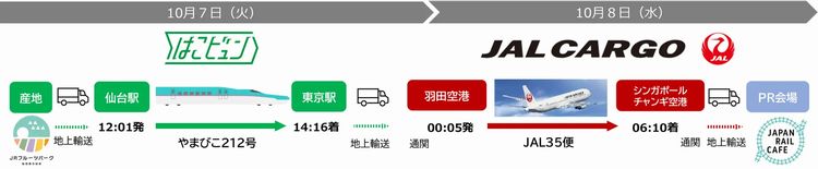 JR東の列車を活用した荷物輸送サービス「はこビュン」と、JALの国際線航空貨物輸送を組み合わせ、新幹線と航空機の速達性を活かし、地産品を仙台からシンガポールまで約19時間で輸送することを計画している。