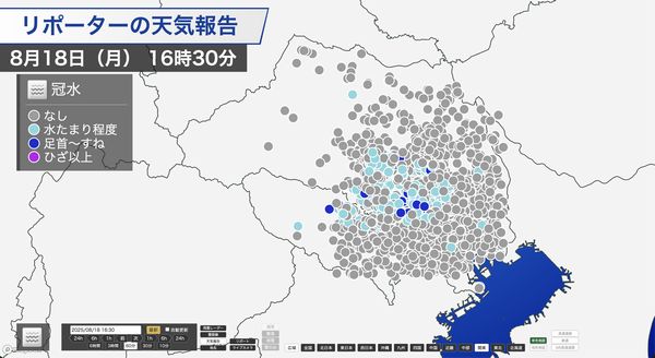 一例が、今年、東京都で1時間に約100mmの雨が観測され記録的短時間大雨情報が発表された際の情報で、当時の冠水報告と雨雲の状況と天気報告を地図にプロットして、どれくらいの雨量になると「水たまり程度」か「足首〜すね」あたりまで冠水しているのかなどを分析した。