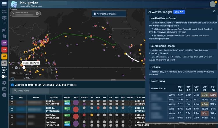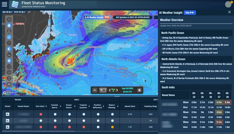 ウェザーニューズは10月2日、船舶の環境性・安全性・経済性に配慮した運航を支援する統合型の航海気象サービス「SeaNavigator」(シーナビゲーター)にAIエンジンを搭載し、新たに気象・海象見解の自動生成や荒天影響船を自動抽出する「AI Weather Insight」(AIウェザーインサイト)と、膨大な海象や航海データの分析で運航最適化を支援する「AI Agent」(AIエージェント)の提供を開始したと発表した。