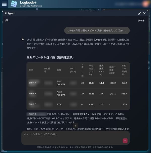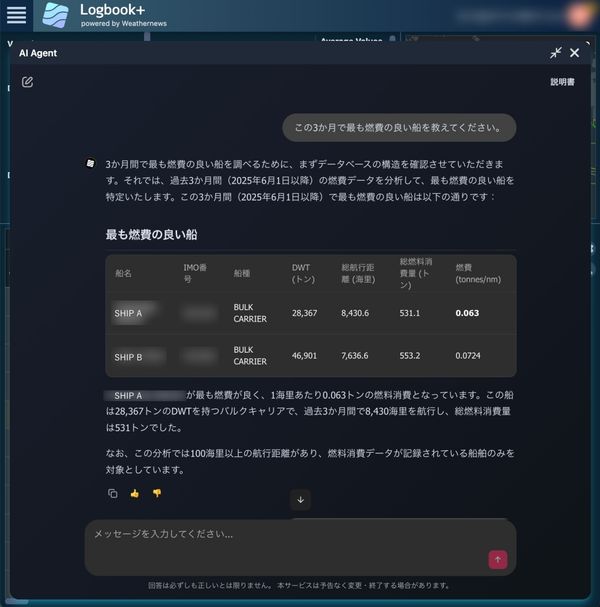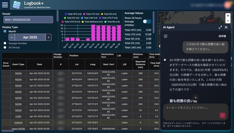 「AI Agent」はテキストで質問するだけで、過去の海象データやユーザーの船舶の位置情報・船舶性能などのデータにアクセスして分析し、チャット形式(対話形式)で回答する。例えば、「この3カ月で燃費が良くて、スピードも出る船舶は?」のように、人手では時間を要する内容もAIによって瞬時に分析できるため、船舶性能の業務解析の迅速化が実現するとみている。