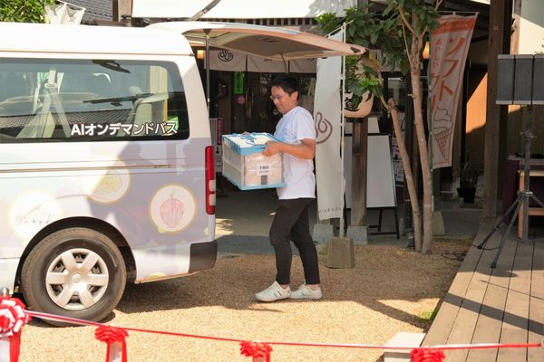 自動運転バスはオンデマンド形式を取り入れており、住民は電話やアプリ(LINE/Web)から利用の予約が可能。併せて、車両の空きスペースや空き時間を活用し、スーパーの総菜や日用品セット、カタログの商品などを自宅まで届ける。