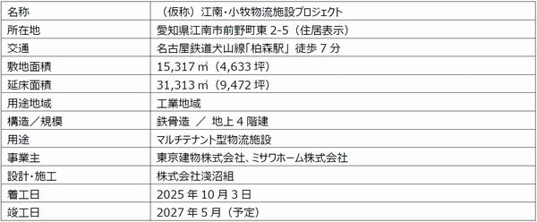 東京建物とミサワホームは10月8日、愛知県江南市で10月3日、マルチテナント型物流施設「(仮称)江南・小牧物流施設プロジェクト」の建設工事に着手したと発表した。