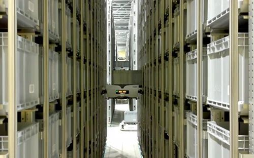 Skypodは前後・左右・上下方向に3次元走行する26台の搬送ロボットと、保管能力に優れる高密度なラックで構成。商品は専用コンテナに2アイテムずつ投入し、ラックに保管する。格納はすべて搬送ロボットが担う。