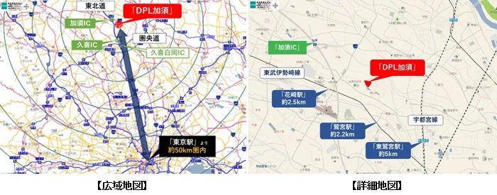 東京都心から約50km圏内に位置し、東北自動車道や首都圏中央連絡道路自動車道(圏央道)へのアクセスが容易で、東北道の加須ICから約3.7km。埼玉エリアや東京都心エリア、東北地方への中継物流としての配送拠点として最適とみている。