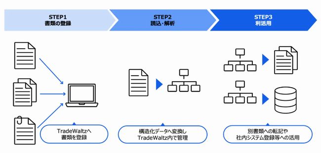 TradeWaltz上に登録したPDF形式の書類をアップロードし、「読取開始」ボタンをクリックすればAIが自動的に内容を解析し、構造化データとして登録・共有できる。必要に応じて自社システムへの取り込みも容易になる見通し。