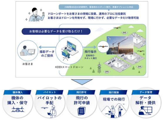 遠隔運航サービスは、ドローンの所有・メンテナンスから、パイロットの手配、飛行許可申請、日々の飛行、撮影データの解析・提供まで、ドローン運用に関わる手間を包括的に委託できるようにしている。2023年7月に運用を始めた。