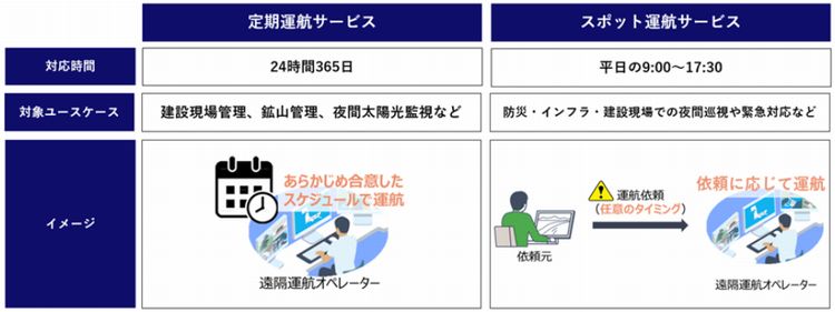 事前に設定したスケジュールで定期飛行を行う24時間365日対応の「定期運航サービス」と、災害発生時など突発的な活用ニーズに対応する「スポット運航サービス」を展開する。