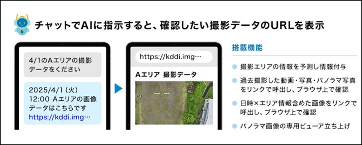 MODEの「BizStack」と連携することで、ドローンで撮影した画像・映像データを検索性の高いデータベースとして構築・蓄積し、遠隔から誰もが瞬時にデータを取得・活用できる環境を実現する。データは自動で撮影エリア・日時ごとにBizStackと連携したKDDIスマートドローンのデータベースに格納し、チャット形式で簡単に呼び出せるようになる。