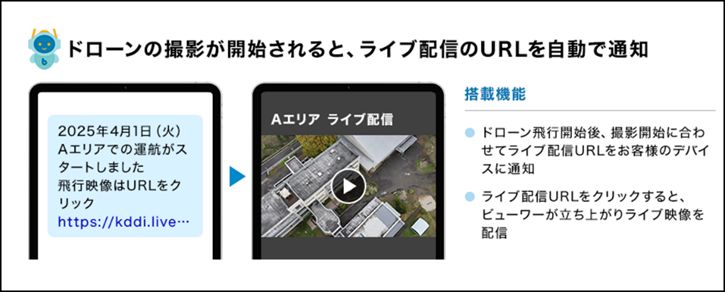 現場に行かなくても遠隔でPCやスマートフォンなどのデバイスから即時確認できるほか、ドローン飛行開始時にはリアルタイム映像の視聴も可能。