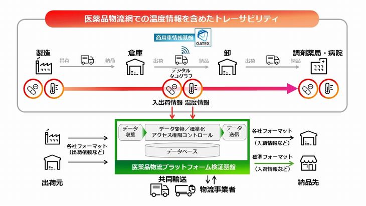 今回の実証実験は3社のほか、デジタルタコグラフなどを手掛けるトランストロン、Ridgelinezを加えた5社共同で国土交通省の公募事業「物流イノベーション実装支援事業」に応募し、「医薬品物流プラットフォーム事業」として採択を受けた。