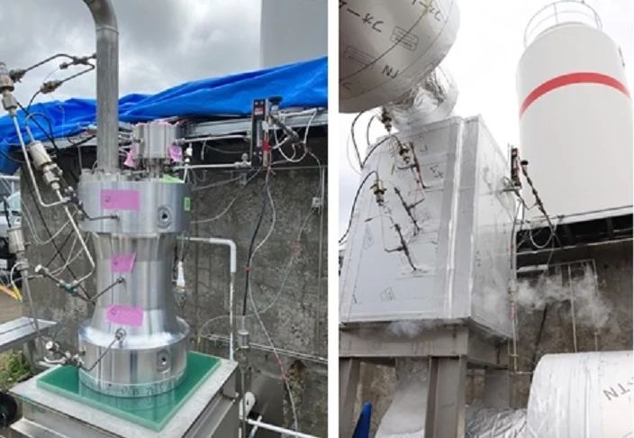 水素航空機向け液化水素ポンプの2次試作(左)と実液試験終了後の試験設備(日機装提供)