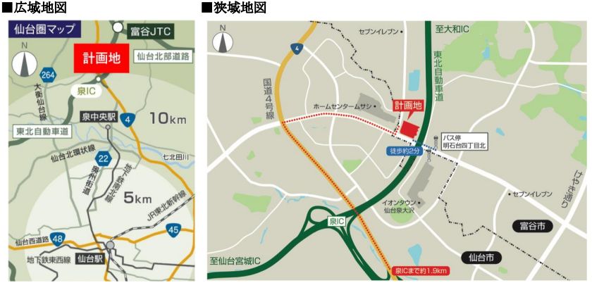 東北自動車道の泉ICから1.6㎞、国道4号線も交わる立地。仙台市内まで30分圏内。東北エリアの配送と市内配送のいずれもカバー可能と想定している。