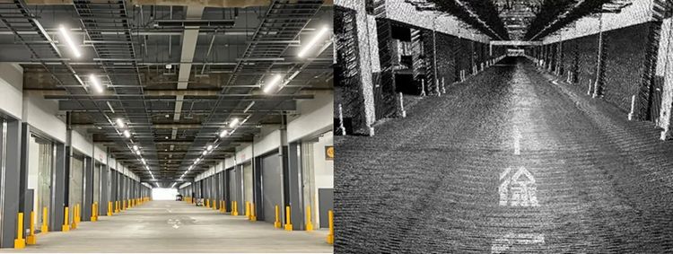(左) 実証実験を展開している「東京流通センター A棟」の施設内画像 (右) 計測車両を走行させ収集した、施設内の高精度地図用点群データ