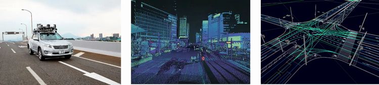 計測車両で周囲の環境を点群データとして取得の上、高精度地図データとして整備する様子