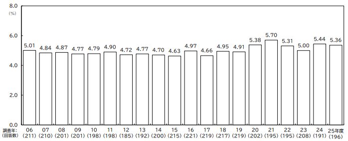 23年度調査にも協力し、比較が可能な130社ベースで見ると5.75%で、23年度から0.03ポイントの微増となった。