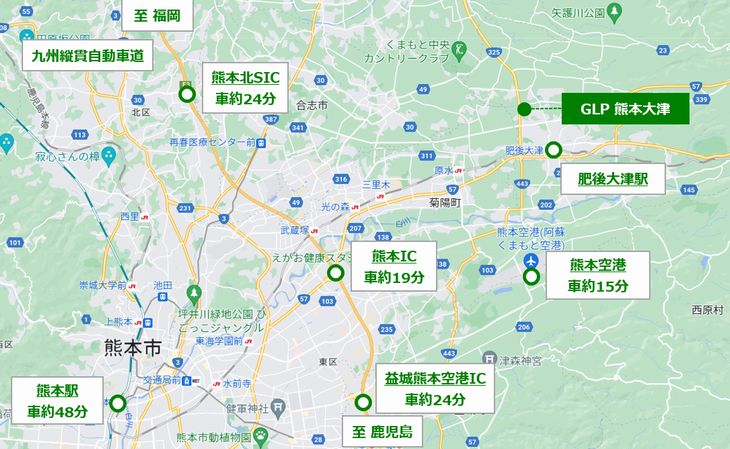 熊本空港から約7km、九州縦貫自動車道の熊本ICから約11km、益城熊本空港ICから約16km。九州全域をカバーする広域配送の拠点として展開することが可能とみている。