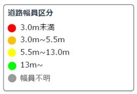 指定した地点の周辺500m範囲内の道路幅を色分けで可視化