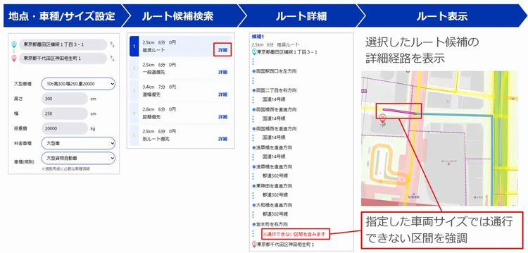 両機能を組み合わせることで、事前にシステム上で目的地までの大型車ルートや、配送先周辺の道路幅を把握しやすくなるとみている。大型車通行不可による急な積み替え作業や配送遅延などの課題を解消し、物流や移動などの現場における効率的で安全な運行計画をサポートできると想定している。