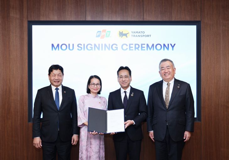 基本合意書に締結した(左から)FPTのチュオン・ザー・ビン創業者兼取締役会長、FPTジャパンのファン・ティ・タィン・ホア取締役執行役員兼最高執行責任者(COO)、ヤマト運輸の阿部珠樹常務執行役員輸送事業統括、ヤマトHD の長尾裕社長(プレスリリースより引用)