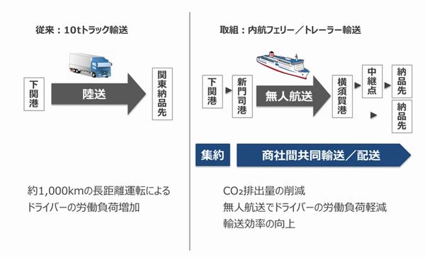 4社はアライアンスを組み、中国から輸入する関東向け貨物を山口県の下関港に集約した上で、同港から神奈川・横須賀港を経由して首都圏の中継点までの幹線輸送で共同輸送を実施。幹線輸送の大部分を関光ロジNEXTグループの東京九州フェリーが担っている。