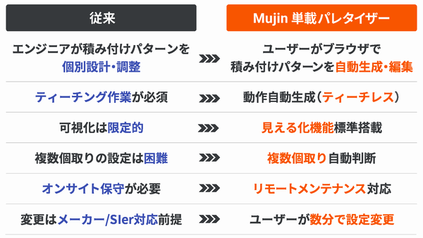 Mujinは11月20日、独自に開発した生産・物流現場の自動化機器を制御するOS(基本ソフト)を搭載した「MujinOSプロダクト」の第1弾「Mujin単載パレタイザー」を発売したと発表した。