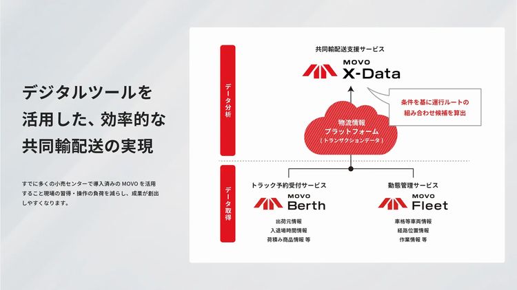 MOVOシリーズには、入荷・輸配送・動態といった標準化された物流データが日々蓄積されており、活用することで各社が個別にデータを持ち寄る必要がなくなり、共同輸配送の検討を迅速かつ効率的に進められると見込む。