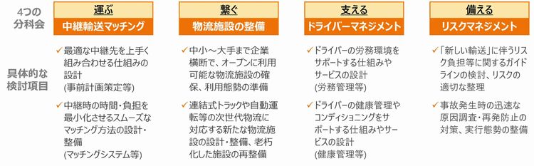 実証運行では車両をスムーズに引き継げるかどうかなどを確認。課題を洗い出し、中継輸送の社会実装へ事故が発生した場合の事業者間の対応などルールと体制の整備を図る。複数の輸送ルートの組み合わせ方を取り決めたり、中継輸送に参加する事業者間で情報共有できるアプリケーションを開発したりすることも想定している。