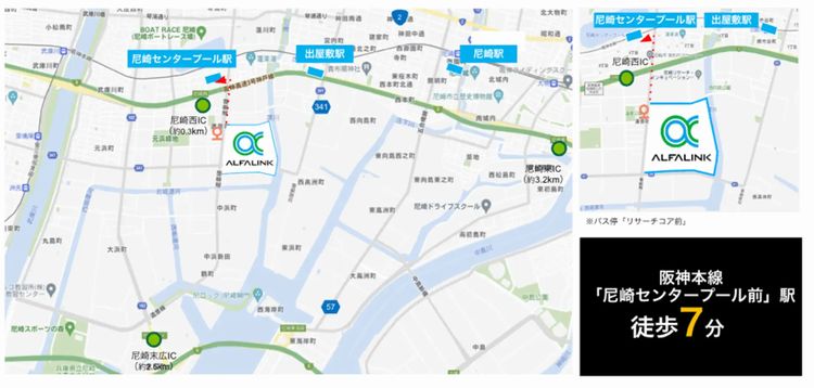 交通アクセス:神戸線「尼崎西」ICより約0.3km、「尼崎末広」ICより約2.5km、阪神本線「尼崎センタープール前」駅より約0.5km(徒歩7分)