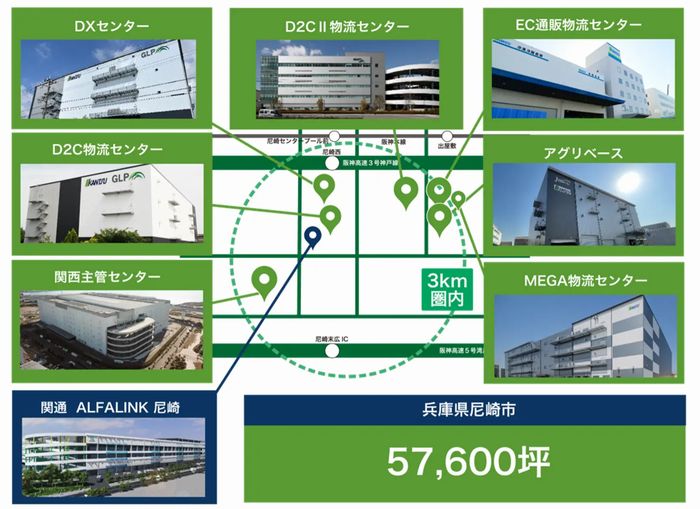 関西尼崎エリアの保有倉庫は計8拠点、総面積が5万7600坪に達する。
