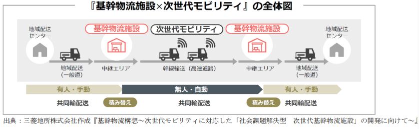 同構想は、自動運転トラックによる幹線輸送など新しい物流システムに対応できるようにするのが特徴で、高速道路のICに直結して利用できるようにする計画。横浜市や愛知県日進市などで構想を進めている。