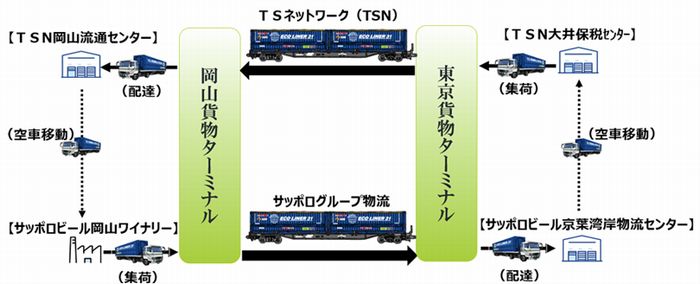 具体的には、サッポログループ物流がサッポロビール岡山ワイナリー(岡山)からサッポロビール京葉湾岸物流センター(千葉)へ輸送する製品と、TSネットワークが大井保税センター(東京)から岡山流通センターへ輸送する製品を、31ftコンテナを使い鉄道でラウンド輸送する。