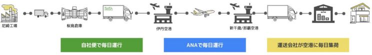 北海道向けの輸送はこれまで早朝の直行便を利用してきたが、羽田経由で昼間帯の空きスペースを活用することにより、低額な料金を提示できるようになった。沖縄向けは昼間便を利用しながら積載効率を上げることで輸送コストの圧縮を実現する。