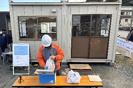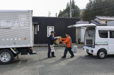 愛設運送スタッフが宅配荷物(ダミー)をグリーンサービススタッフに手渡し(Aコープ作手店駐車場)