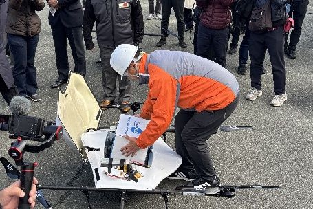 物流専用ドローンPD4B-M-ANとAirTruckを前に、撮影に応じる代表者