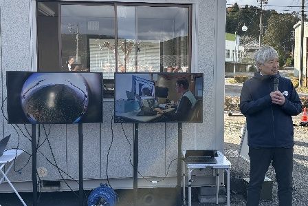 山梨県小菅村からの遠隔運航の様子とAirTruckの機上カメラ(FPV)のライブ映像を説明するNEXT DELIVERYの田路圭輔代表取締役