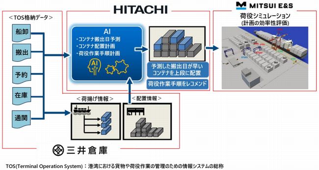 三井倉庫が有するコンテナターミナル運営のノウハウを活用しながら、日立のAI技術を駆使してコンテナ貨物の特性データを基に搬出日予測、コンテナ配置計画、荷役作業手順計画を立案。三井E&Sが開発した荷役シミュレータを使って計画の効率性を検証・評価し、実運用に進めていきたい考え。
