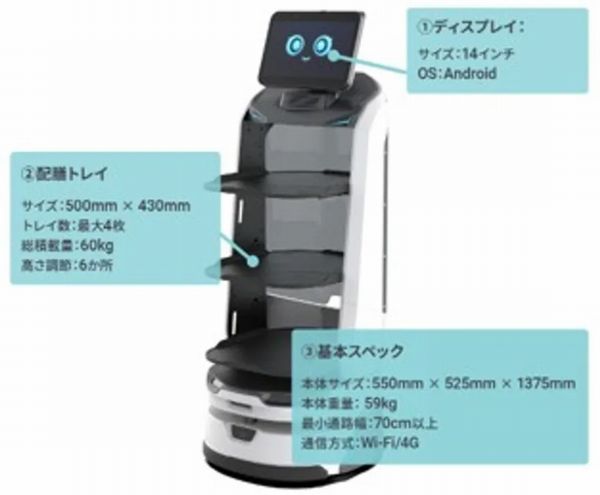 ロボットには販促用の画像や動画表示、音声アナウンスといった機能を装着。最大で60kgの荷物積載が可能という。