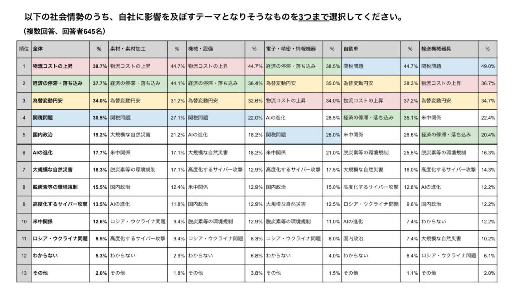 ただ、自動車・輸送機械器具では「関税問題」がトップになるなど、業種によって回答の傾向に違いが見られた。