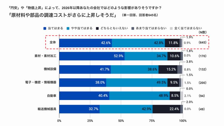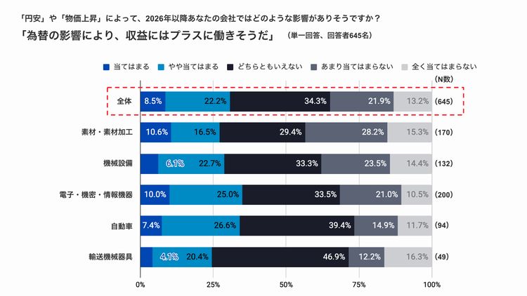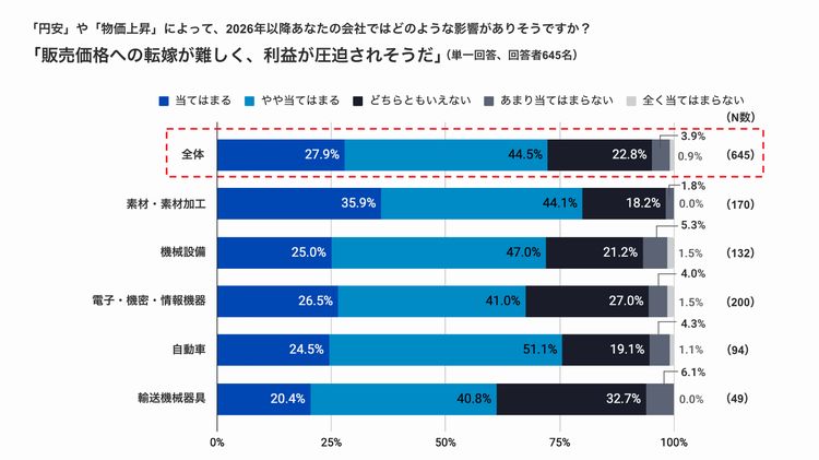 「円安」「物価上昇」の影響では、業種を問わず「調達コスト上昇」(85.4%)と「価格転化できず利益圧迫」(72.4%)が際立っており(当てはまるとやや当てはまるの合計)、「為替影響で利益がプラス」(30.7%)を大きく上回った。