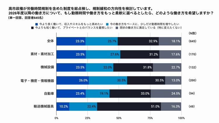 労働時間規制について「今より長く働きたい」層が約半数を占め、長く働く意欲を持つ層が一定存在することが分かった。