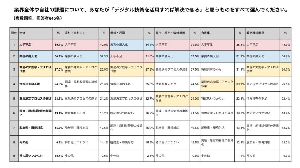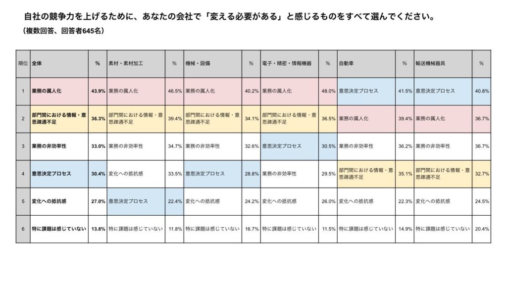 ・競争力強化のために「変える必要があること」は、「業務の属人化」(43.9%)が首位。自動車/輸送機械器具では「意思決定プロセス」が最多となり、業種による課題の質に違いが見られた。