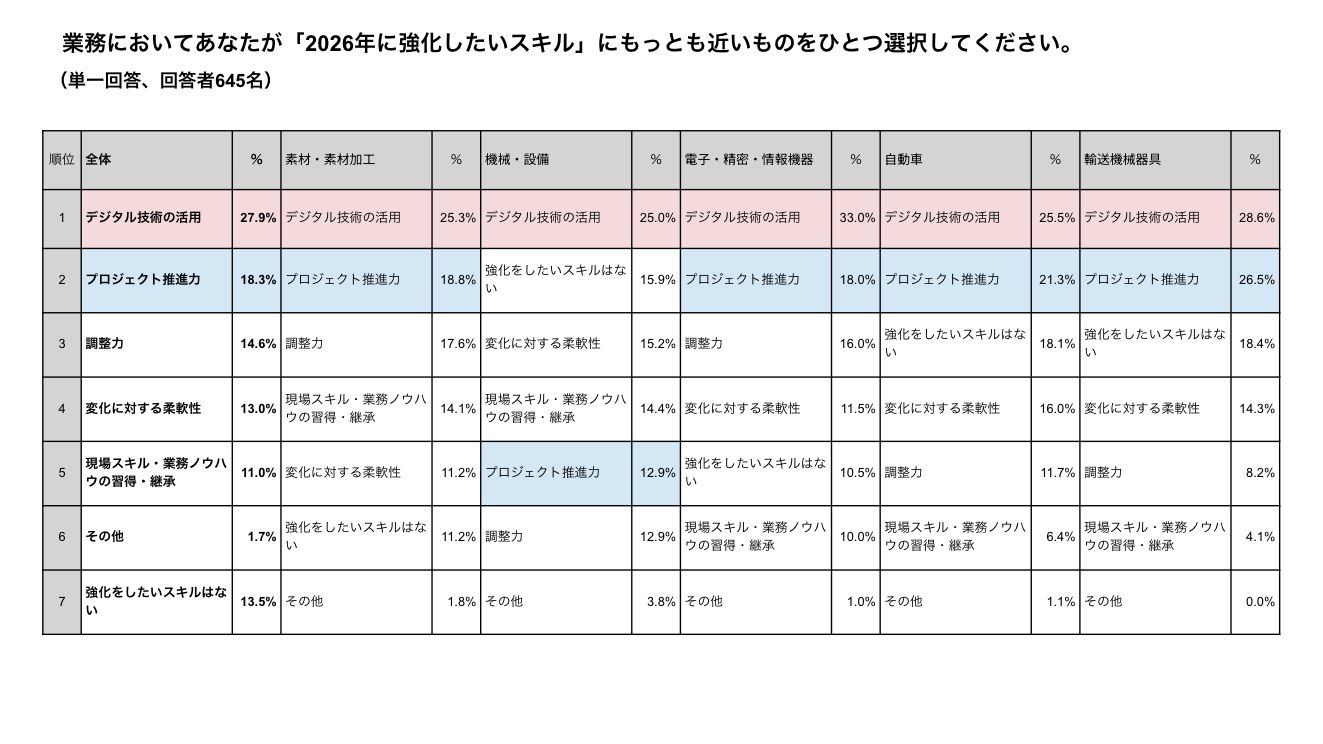 26年に強化したいスキルとして、全体で最多となったのは「デジタル技術の活用」(27.9%)で、約4人に1人が、今後の業務に向けデジタルスキルを強化したいと考えていることが分かった。