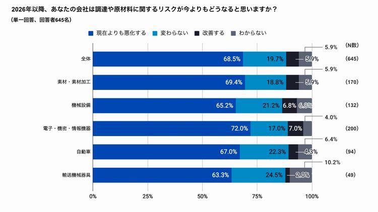 2026年以降の調達や原材料に関するリスクの見通しを聞いたところ、全体の68.5%が「現在よりも悪化する」を選択しており、厳しい見方が多いことが示された。