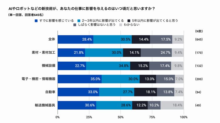 AI/ロボット技術の影響実感は、全体の半数超が「すでに影響」または「2〜3年以内に影響」と回答。最も比率が高かったのは電子・機密・情報機器(35.0%)、最も低かったのは素材・素材加工(21.8%)だった。